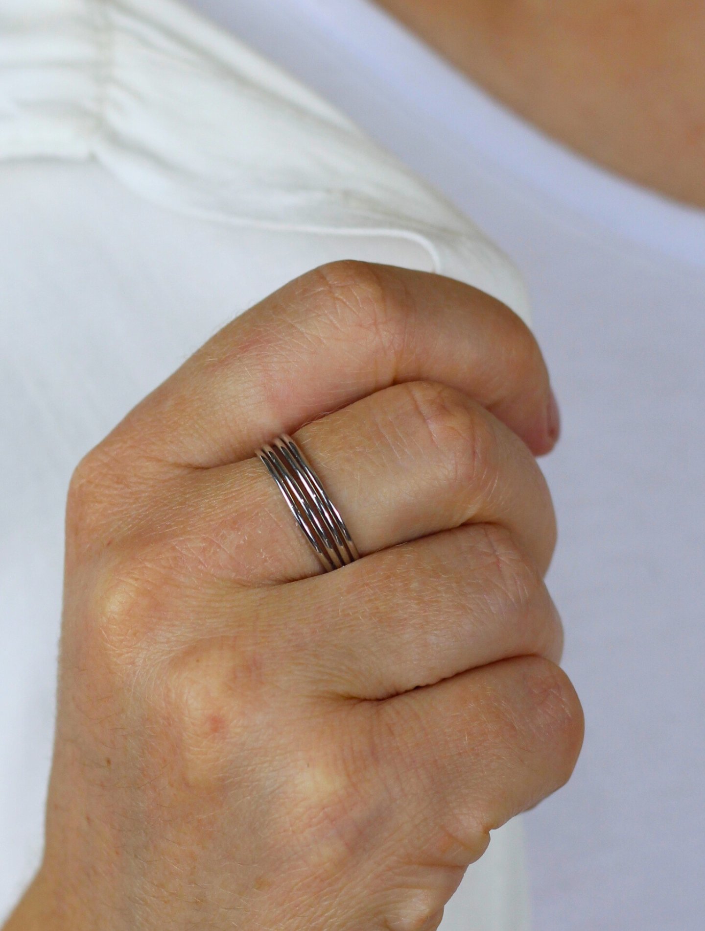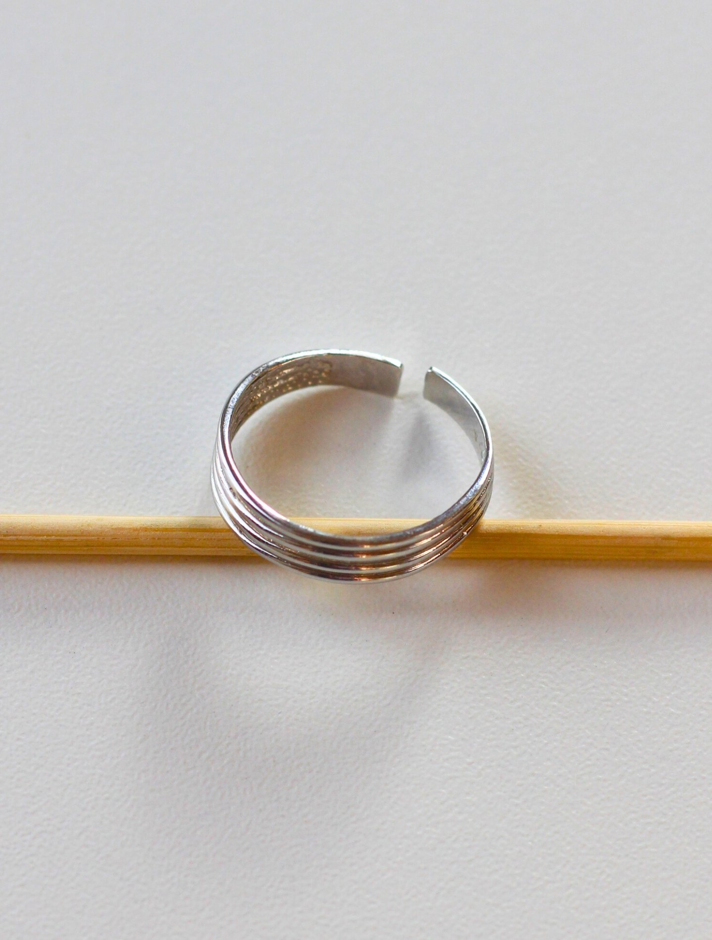 Anel Regulável Cecília Linhas banhado a ródio branco, com quatro faixas paralelas que criam brilho e movimento delicado. Hipoalergênico e versátil, combina modernidade e sofisticação de forma imponente e elegante.