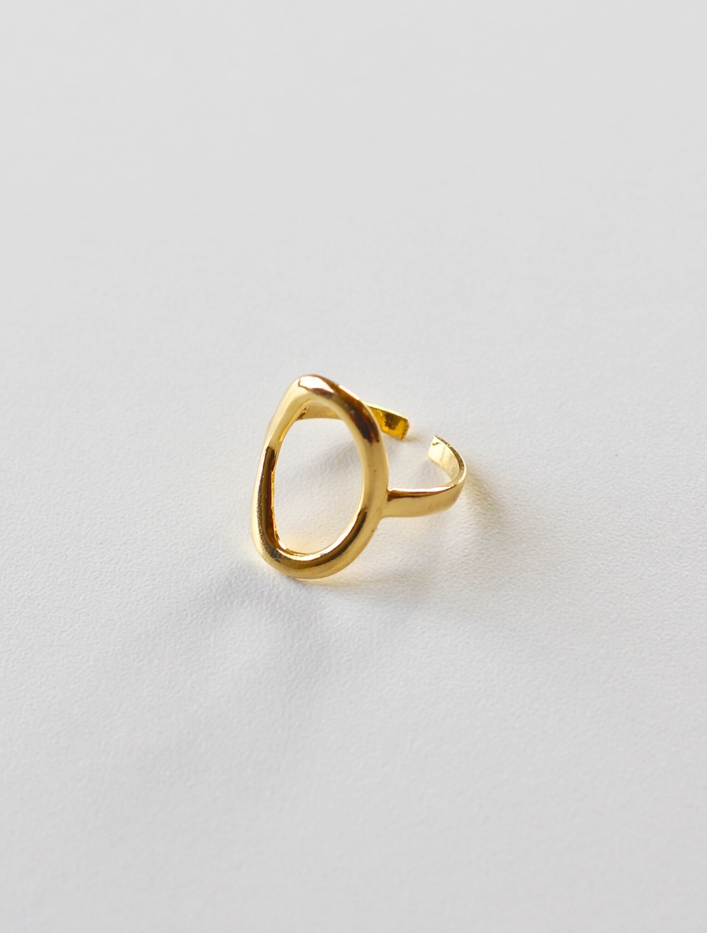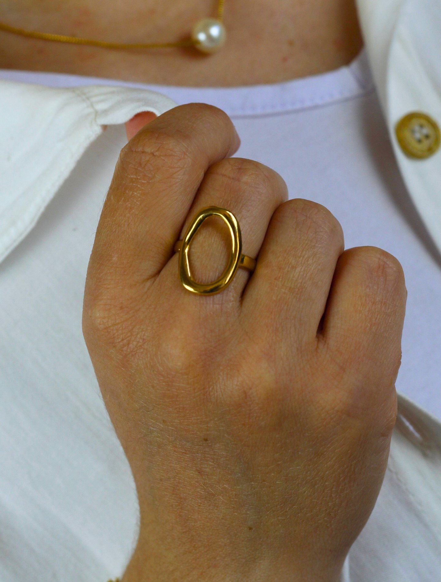 Anel Regulável Suzanna Oval banhado a ouro 18K com design minimalista e vazado. Hipoalergênico e versátil, combina delicadeza e sofisticação para qualquer look.