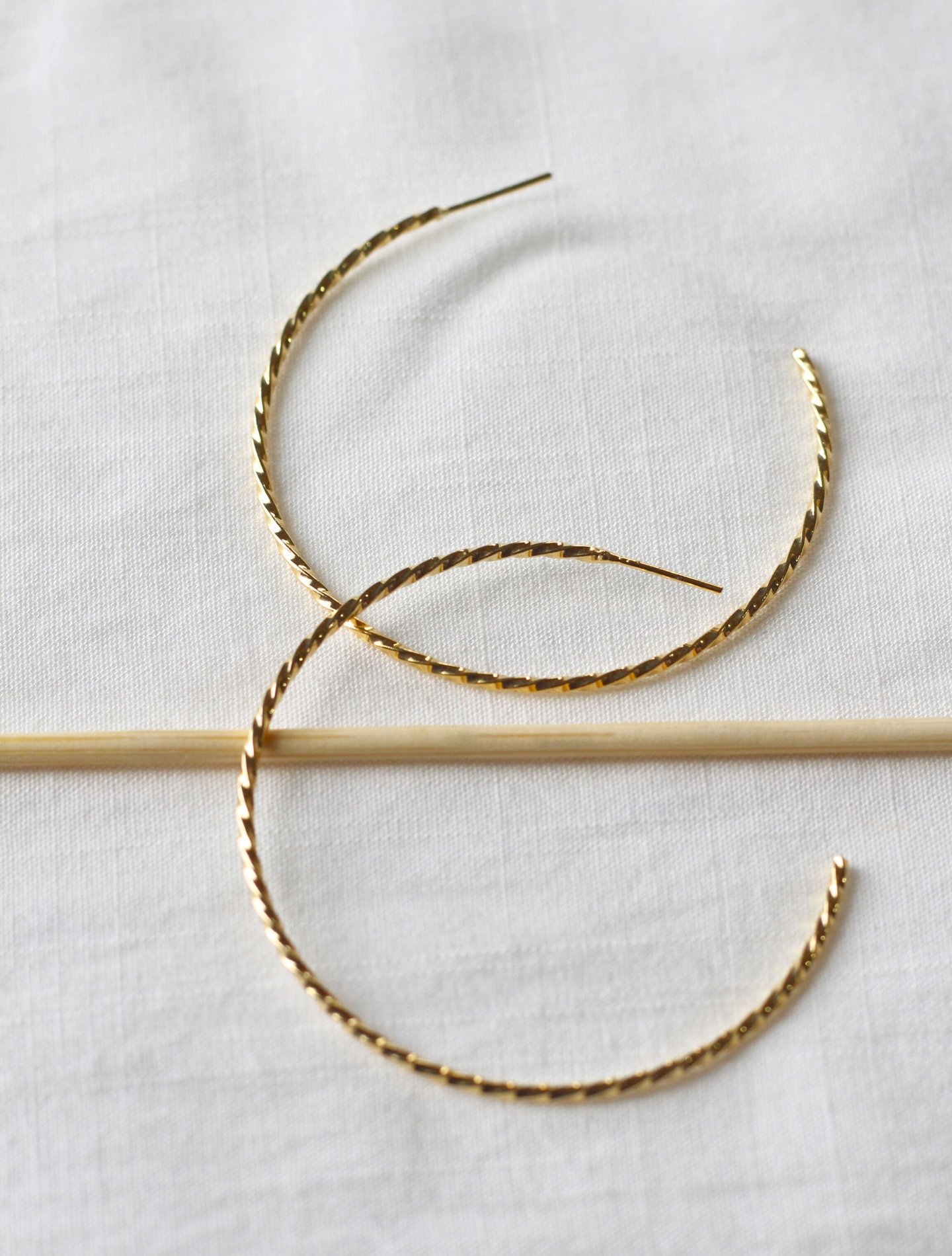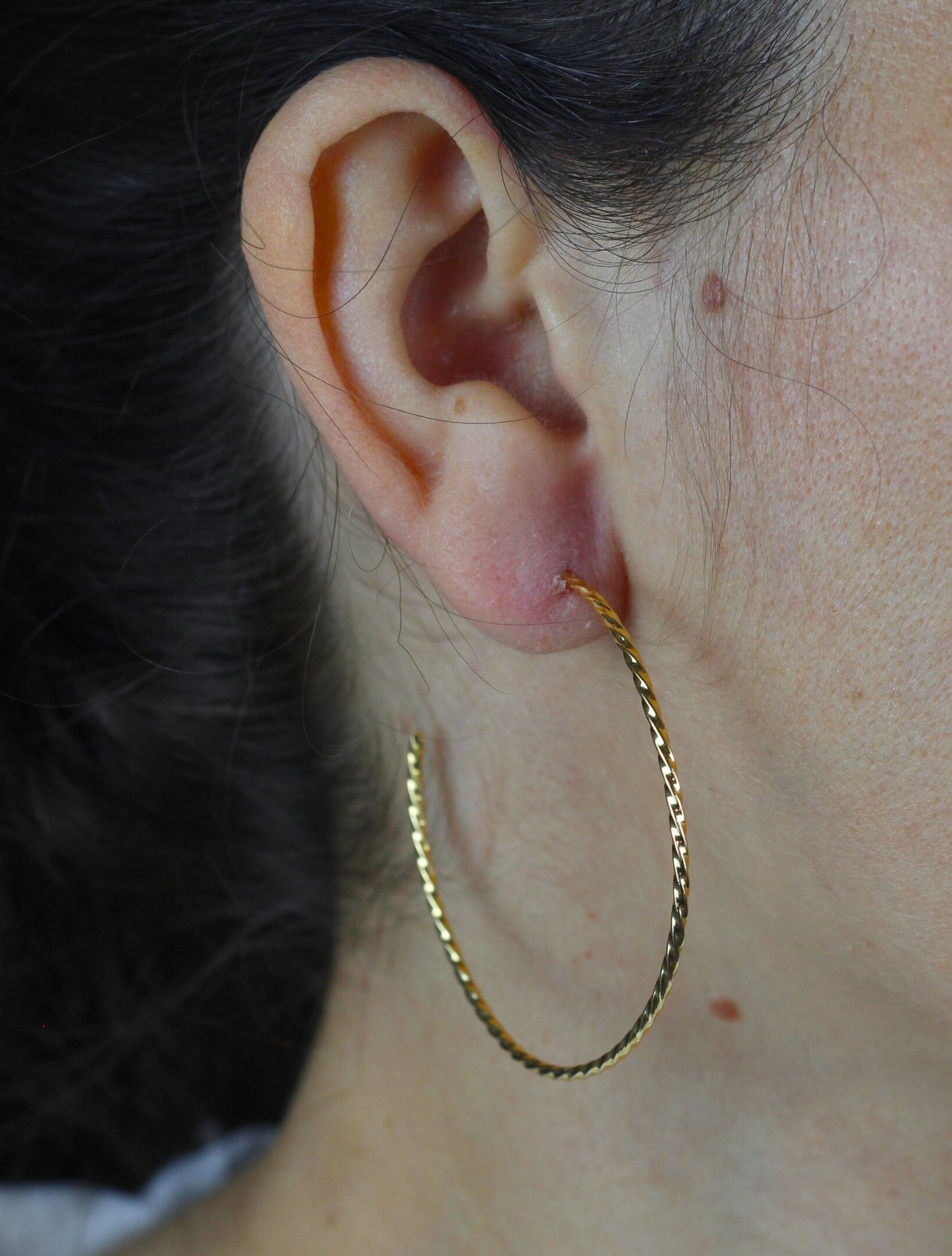 Argola grande de design torcido banhada a ouro 18K, com brilho intenso e acabamento em verniz italiano. Leve e 100% hipoalergênica, une conforto, durabilidade e elegância para qualquer ocasião.