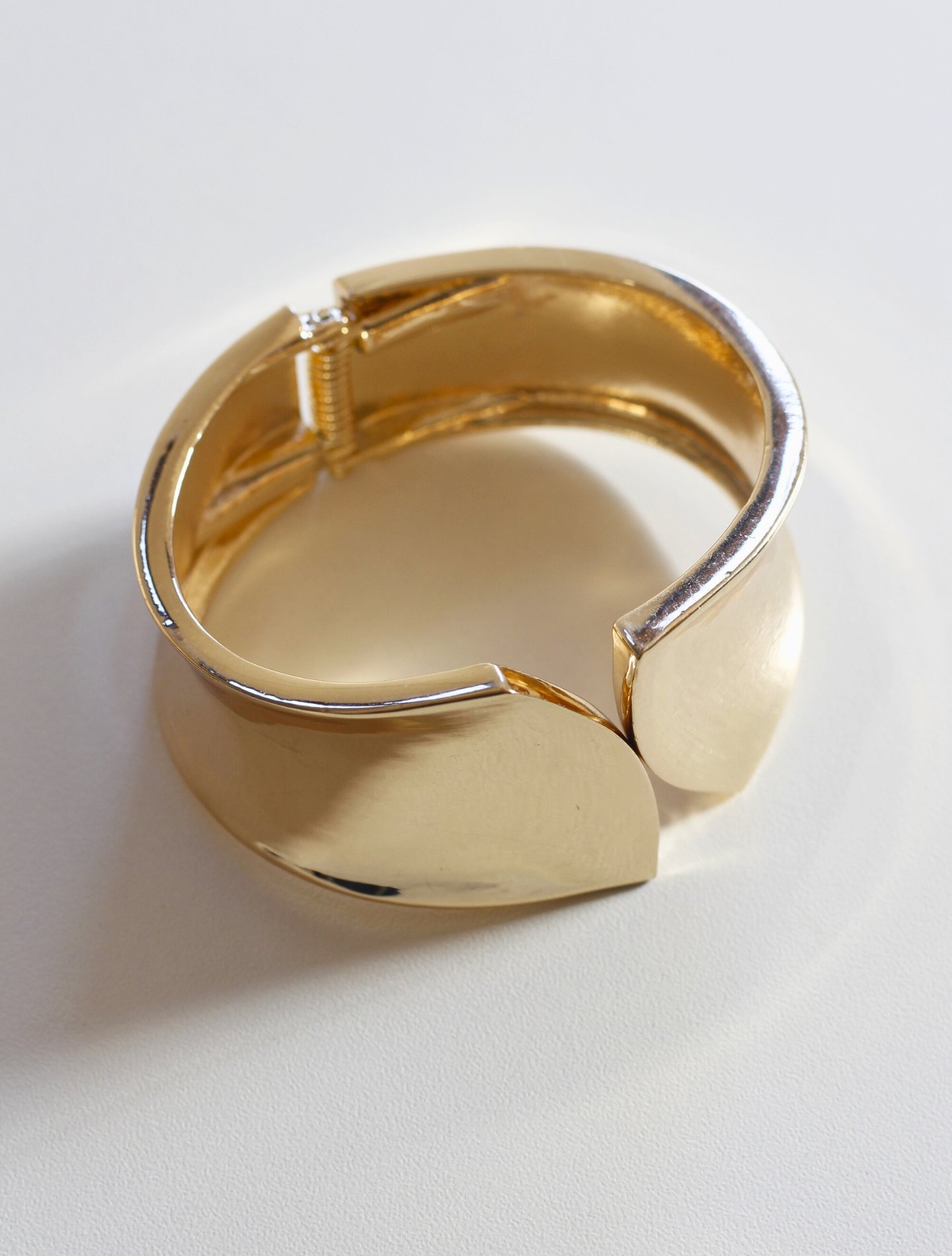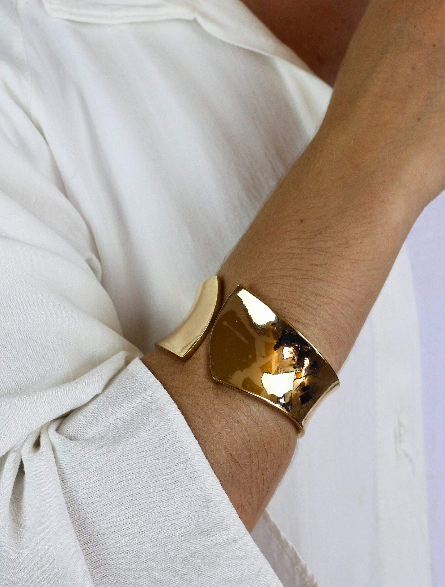 O Bracelete Suzanna destaca o pulso com seu design largo e abertura frontal, criando uma linha contínua e moderna. O acabamento liso realça o brilho do banho em ouro 18K, enquanto a estrutura firme mantém presença sem perder o conforto.