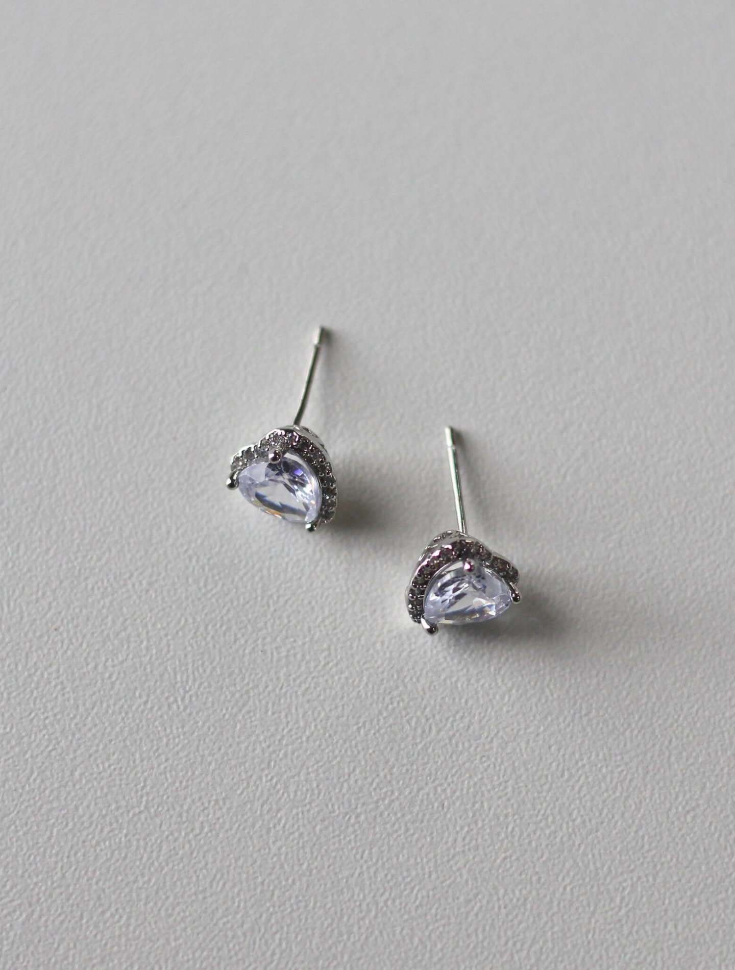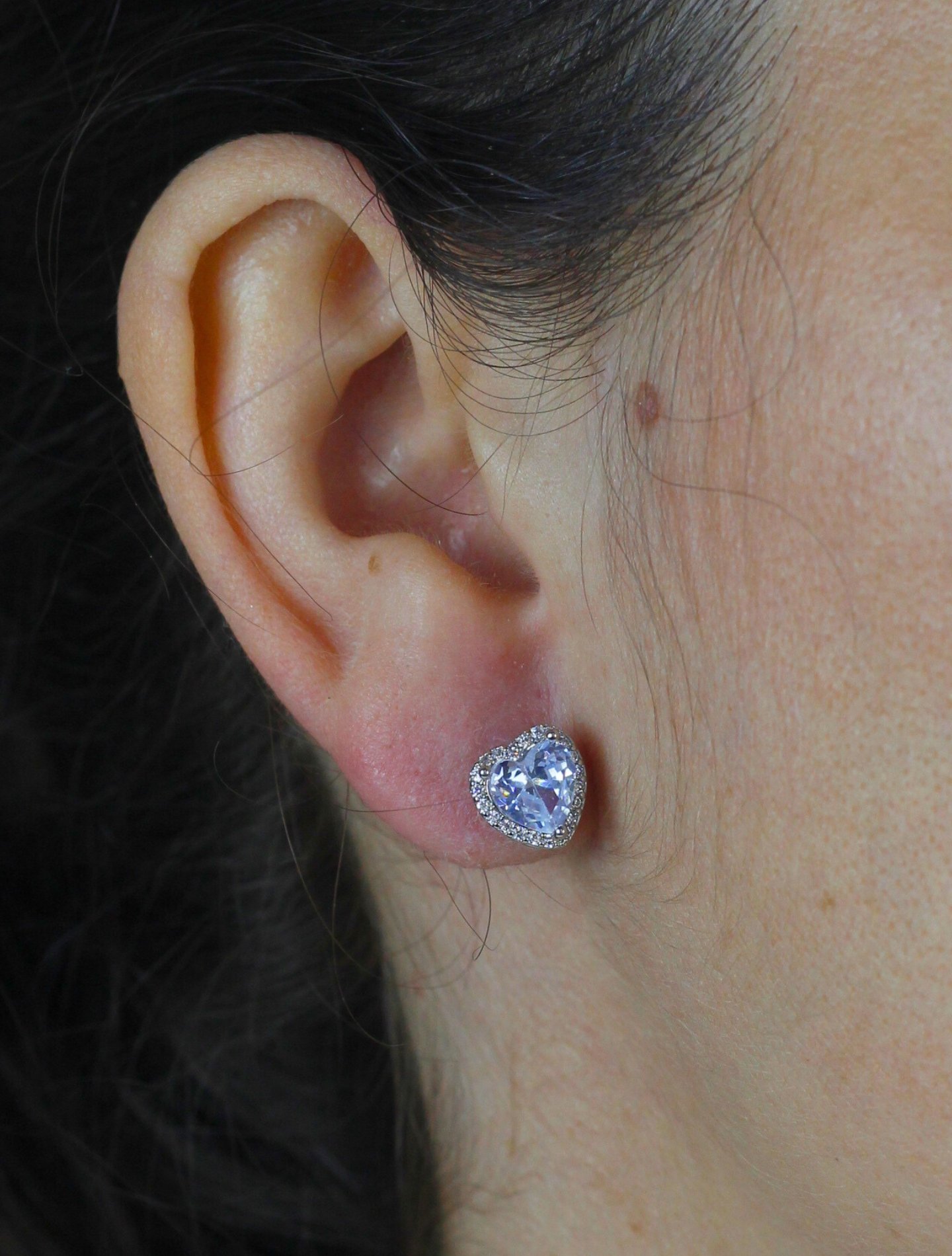 Brinco Nina Coração Cristal banhado a ródio branco com microzircônias e cristal central, leve e versátil, conferindo um toque moderno e romântico ao visual.