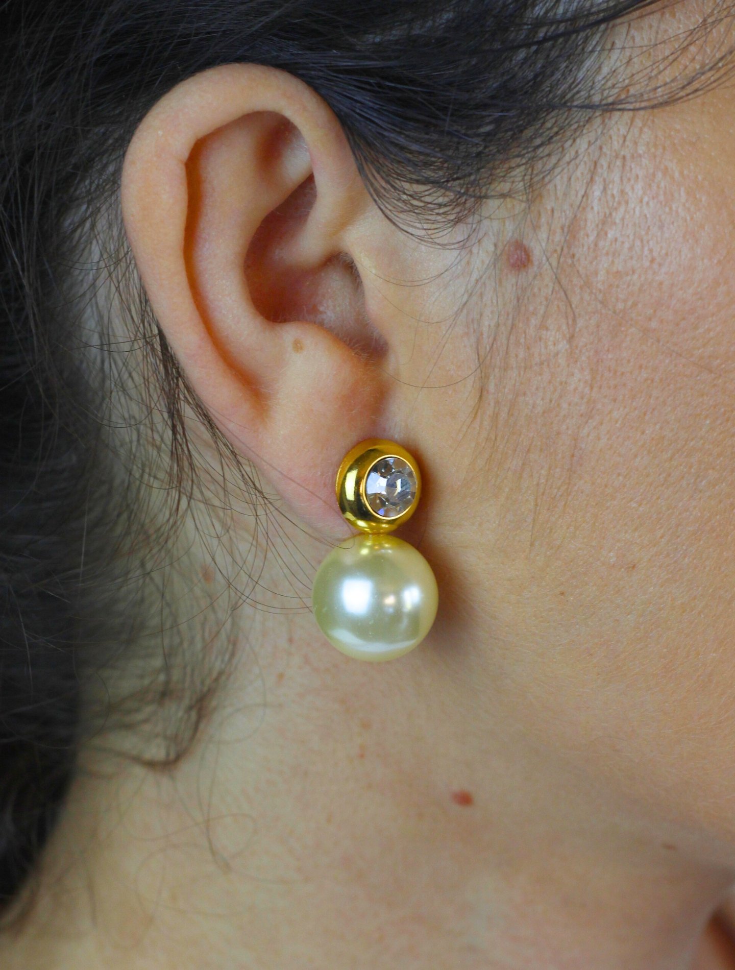 Brinco Pomona banhado a ouro 18K, combinando ponto de luz delicado e pérola de destaque. Hipoalergênico e confortável, traz charme atemporal e presença sutil ao look.