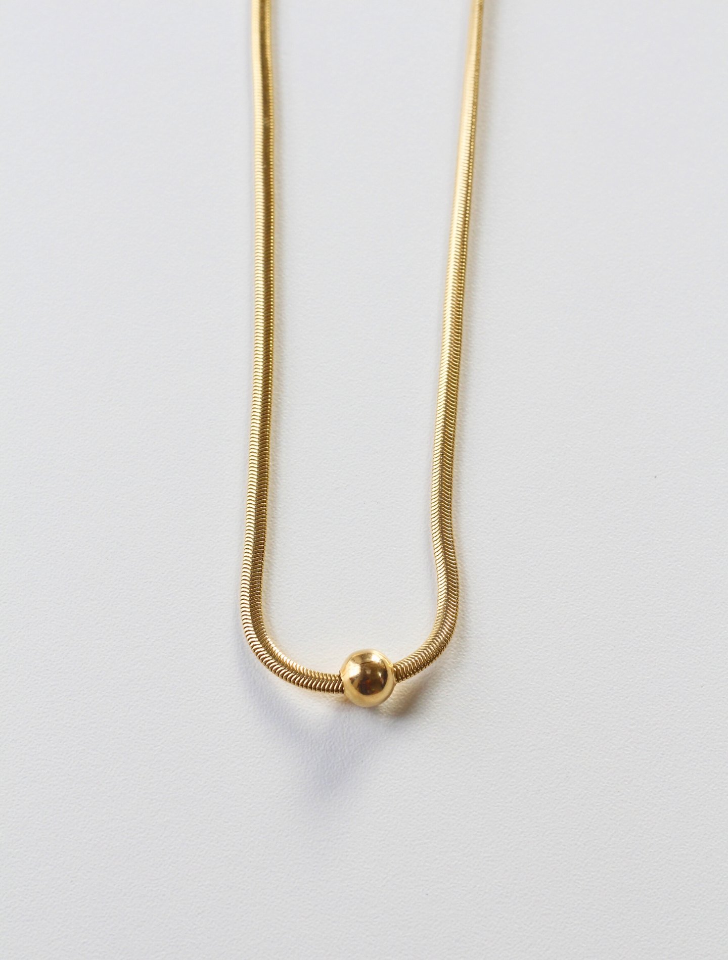 Colar Clarissa banhado a ouro 18K com pingente esférico que reflete a luz em movimentos sutis. Leve e hipoalergênico, transforma produções simples em looks sofisticados com toque de modernidade e presença discreta.