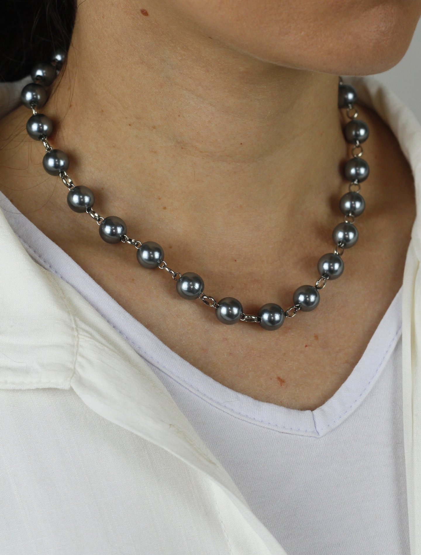 Colar Melissa Pérola Cinza com pérolas acinzentadas e entremeios em ródio branco. Curto, hipoalergênico e versátil, traz sofisticação, delicadeza e charme moderno a qualquer look.