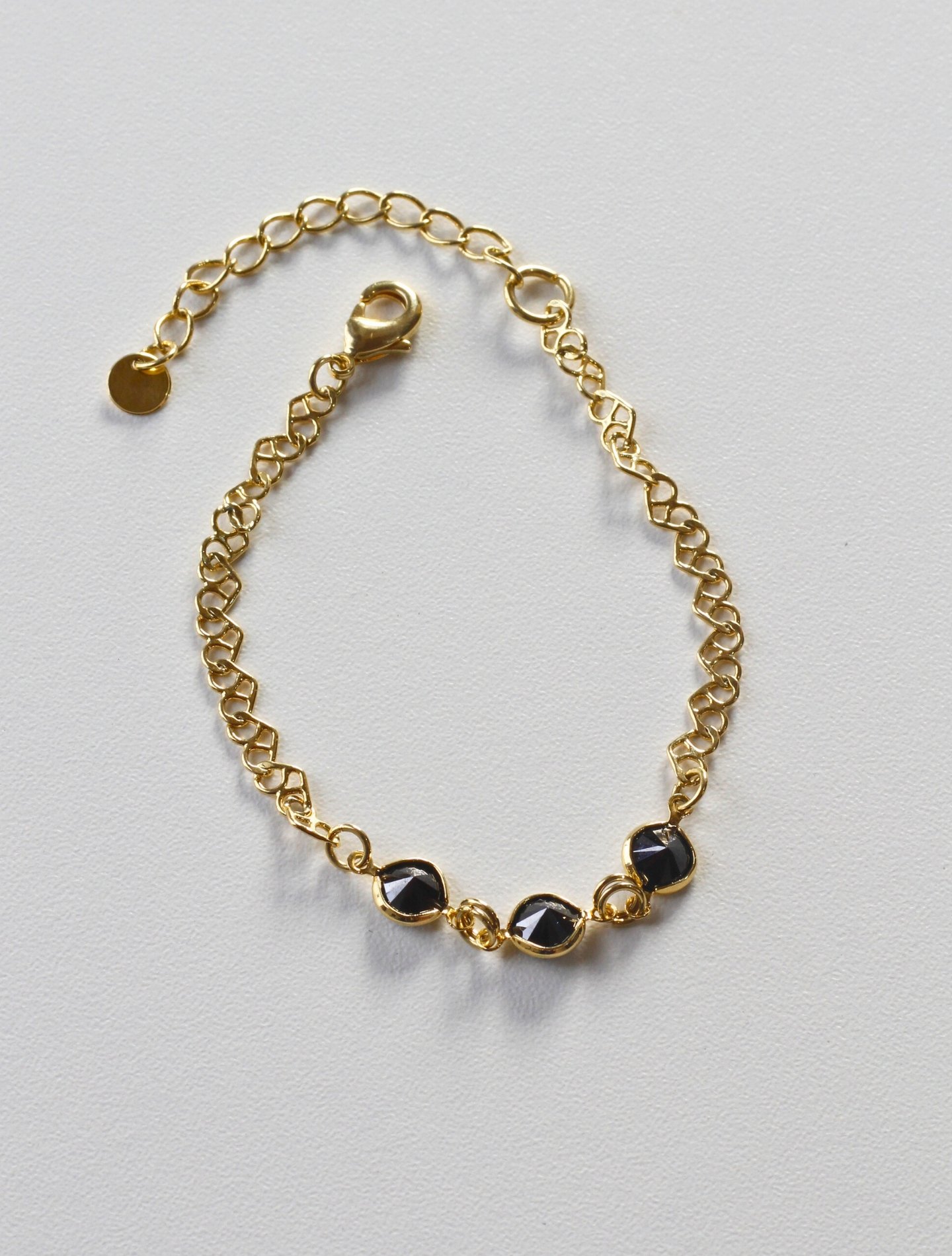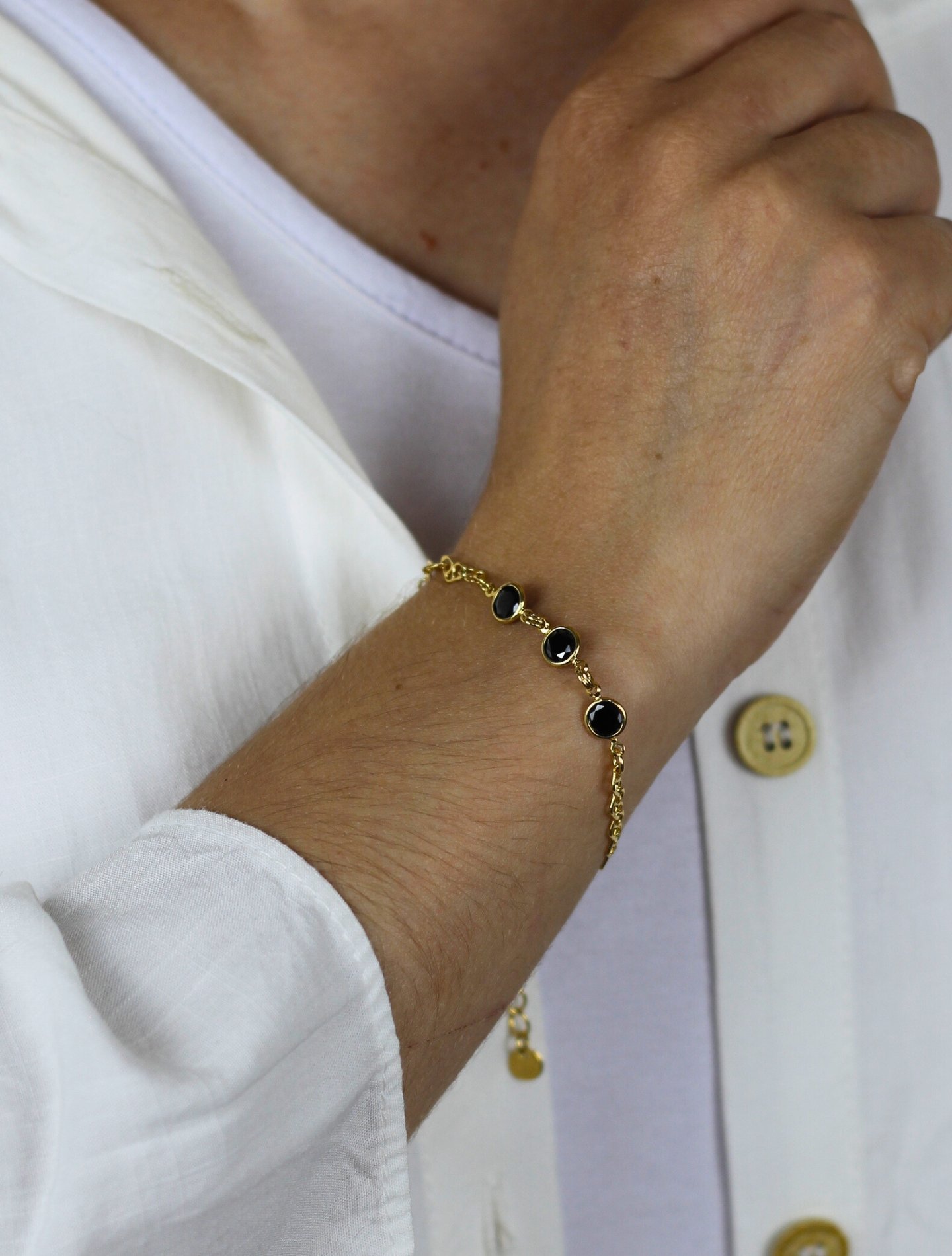 Pulseira Andy banhada a ouro 18K, com pedra ônix que combina força e sofisticação. Hipoalergênica e versátil, traz presença marcante e elegância autêntica a qualquer look.